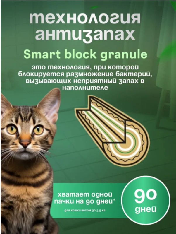 Кошачий наполнитель для кошачьего туалета имеет улучшенный состав гранулы, теперь запах еще и блокируется.