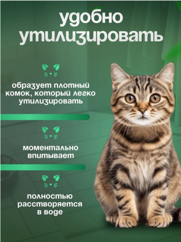 Он: идеально борется с запахом - даже если неделю не убирать лоток. За счет того, что не дает развиваться бактериям; наполнитель смываемый, его удобно утилизировать - просто комок выбрасываете