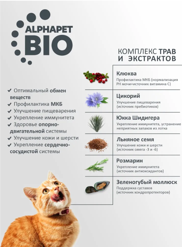 85% мясного белка 30% свежего мяса Баланс магния, кальция и фосфора для здоровья мочевыделительной системы Уникальный комплекс натуральных добавок AlphaPetBIO® Натуральные ингредиенты Не содержит ГМО, искусственных красителей и ароматизаторов Ингредиенты, пригодные в пищу человеку, уровня Human Grade Бережная технология, сохраняющая вкусовые и питательные свойства свежего мяса Ингредиенты свежее мясо 30% (говядина, свиные печень и сердце, курица), дегидрированное мясо домашней птицы 19%, рис 15%, ячмень, животный жир, овес, гидролизованная куриная печень, желтый горошек, витаминно-минеральная смесь, пивные дрожжи, сушеная мякоть сахарной свеклы, комплекс AlphaPetBIO® (зеленогубый моллюск, календула, одуванчик, льняное семя, цикорий, клюква, Юкка Шидигера, розмарин), рыбий жир, таурин, DL-метионин, антиоксидант. Гарантируемые показатели сырой протеин - 32%, сырой жир - 15%, сырая клетчатка - 2,2%, зола - 8,0%, кальций - 1%, фосфор - 0,7%, омега-3 - 0,9%, омега-6 - 3%, влажность - 8%. Добавленные вещества магний - 0,08%, медь - 6 мг/кг , железо - 84 мг/кг, марганец - 6,9 мг/кг , цинк - 180 мг/кг, йод - 1,4 мг/кг, селен - 350 мкг/кг, таурин - 1 277 мг/кг, витамин А - 15 000 МЕ/кг, витамин D – 1 200 МЕ/кг, витамин Е - 100 МЕ/кг, витамин В1 -5,95 мг/кг, витамин В2 - 4,3 мг/кг, витамин B6 -2,66 мг/кг, ниацин - 42,7 мг/кг, пантотеновая кислота - 9,1 мг/кг, холин - 2 716 мг/кг, биотин - 140 мкг/кг, фолиевая кислота - 801,5 мкг/кг, хондроитин - 98 000 мкг/кг, глюкозамин - 28 000 мкг/кг, DL-метионин + цистеин – 4,5г/кг. Подробнее