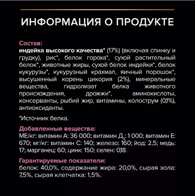индейка (17%**), рис**, сухой белок индейки**, концентрат белка гороха**, животный жир, соевый белок**, кукурузный глютен**, кукурузный крахмал, высушенный корень цикория (2%*), минеральные вещества, вкусоароматическая кормовая добавка, дрожжи**, аминокислоты, витамины, рыбий жир **Источники протеина *Натуральный пребиотик консерванты антиоксиданты."