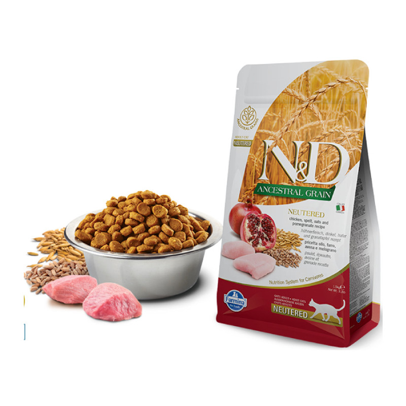 Сухой корм Farmina Natural & Delicious Low Grain Adult Cat Neutered Spelt, Oats, Chicken & Pomegranate с курицей и гранатом — это полноценное и сбалансированное питание для всех взрослых кастрированных котов и стерилизованных кошек.