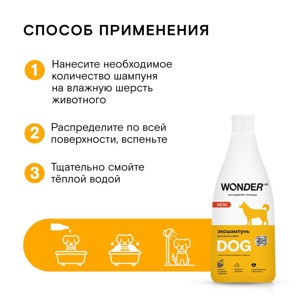 Гипоаллергенный шампунь подходит для собак любых пород и безопасен для щенков. Средство для мытья собак предотвращает спутывание шерсти и эффективно удаляет загрязнения после веселых прогулок в любую погоду. Благодаря отсутствию лишних ароматов, шампунь не будет раздражать вашего любимца и не будет провоцировать аллергию. Экономичный расход и удобный дозатор. В составе экошампуня нет отдушек, красителей и щелочного мыла. После мытья экошампунем, шерсть приобретает здоровый блеск и хорошо расчесывается. Средством можно мыть и лапы животного после прогулки. Шампунь не оставляет посторонних запахов на шерсти собаки, полностью смывается, что безопасно для животного при вылизывании после купания. Экошампунь wonder lab одобрен профессиональными грумерами. Экосредства wonder lab созданы на основе инновационного компонента Biomicrogel, который сделан из овощей и фруктов. Средства wonder lab не вредят окружающей среде, не содержат опасных компонентов и разлагаются на 98% за 1 день. Состав: Вода, микрогели полисахаридов (Biomicrogel), АПАВ (на основе пальмоядрового маста), НПАВ (на основе кокосового масла), кокамидопропил бетаин (на основе кокосового масла и слекловичного сахара), консервант.(Biomicrogel) 500 S3 для быстрого и безопасного очищения кожи и шерсти собак. Подробнее