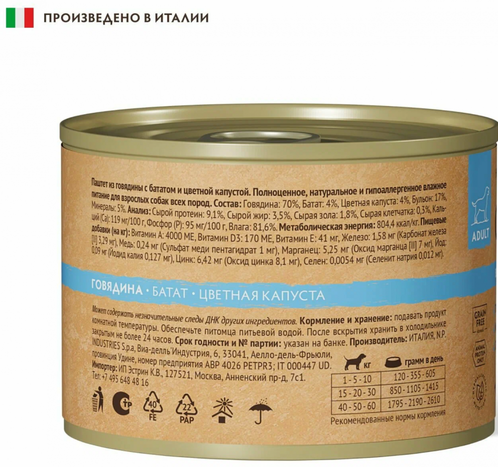 СоставnГовядина: 70%, Батат: 4%, Цветная капуста: 4%, Бульон: 17%, Минералы: 5%.