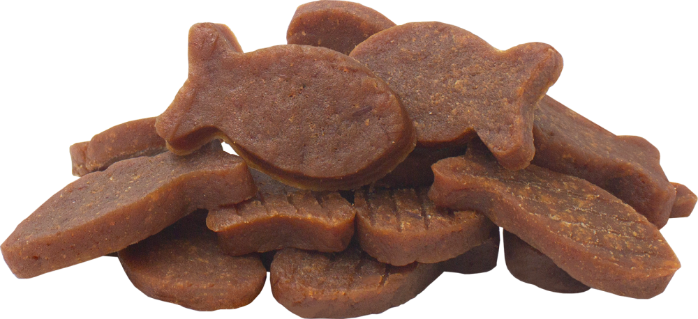 Лакомство для собак из лосося серии «Деревенские лакомства - Уход за шерстью» в виде аппетитных «рыбок».