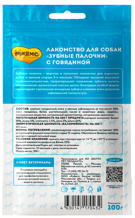 Мнямс DENTAL "Зубные палочки" с говядиной – вкусное и полезное лакомство для взрослых собак и щенков старше 3-х месяцев. Обладают высокой вкусовой привлекательностью, предотвращают появление зубного налета, обеспечивают деликатный массаж десен. Благодаря особой форме гарантируют тщательное очищение зубов и снижают риск развития