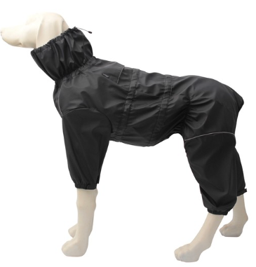 Благодаря высокому воротнику и регулировке по линиям шеи и талии костюм-дождевик садится "по фигуре" питомца и не стесняет его движений во время прогулки. Изделие надежно фиксируется при помощи молнии на боку и двух эластичных пряжек, а на штанинах предусмотрены удобные резинки, препятствующие попаданию грязи или налипанию снега снизу. Ширина штанин регулируется за счет липучек.