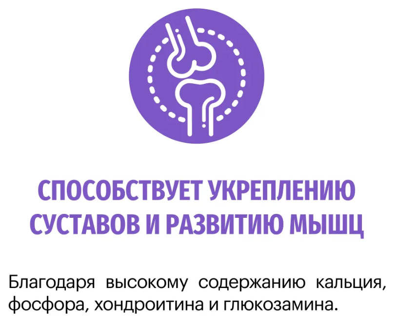 Высокое содержание: кальция, фосфора, хондроитина и глюкозамина - способствует поддержанию здоровья костей и суставов щенков