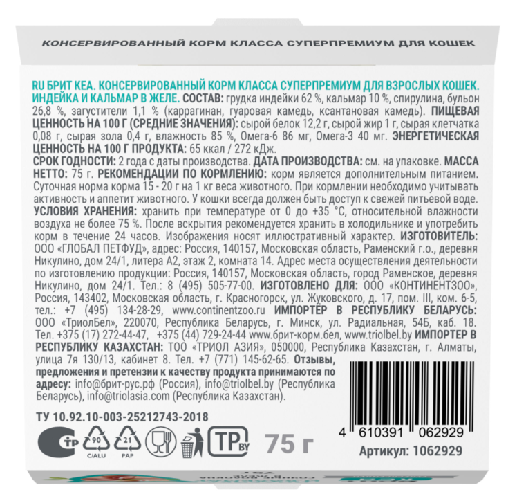 Вся линейка паучей и ламиcтеров Брит Кеа "Волокна в желе" построена на индейке как основном белке, с добавками разных морепродуктов. Это уникальная фишка линейки — моно-белковый состав на базе индейки + сочные волокна и желе, обогащенные спирулиной и таурином, создающие функциональное лакомство для взрослых кошек и котят. Лакомство