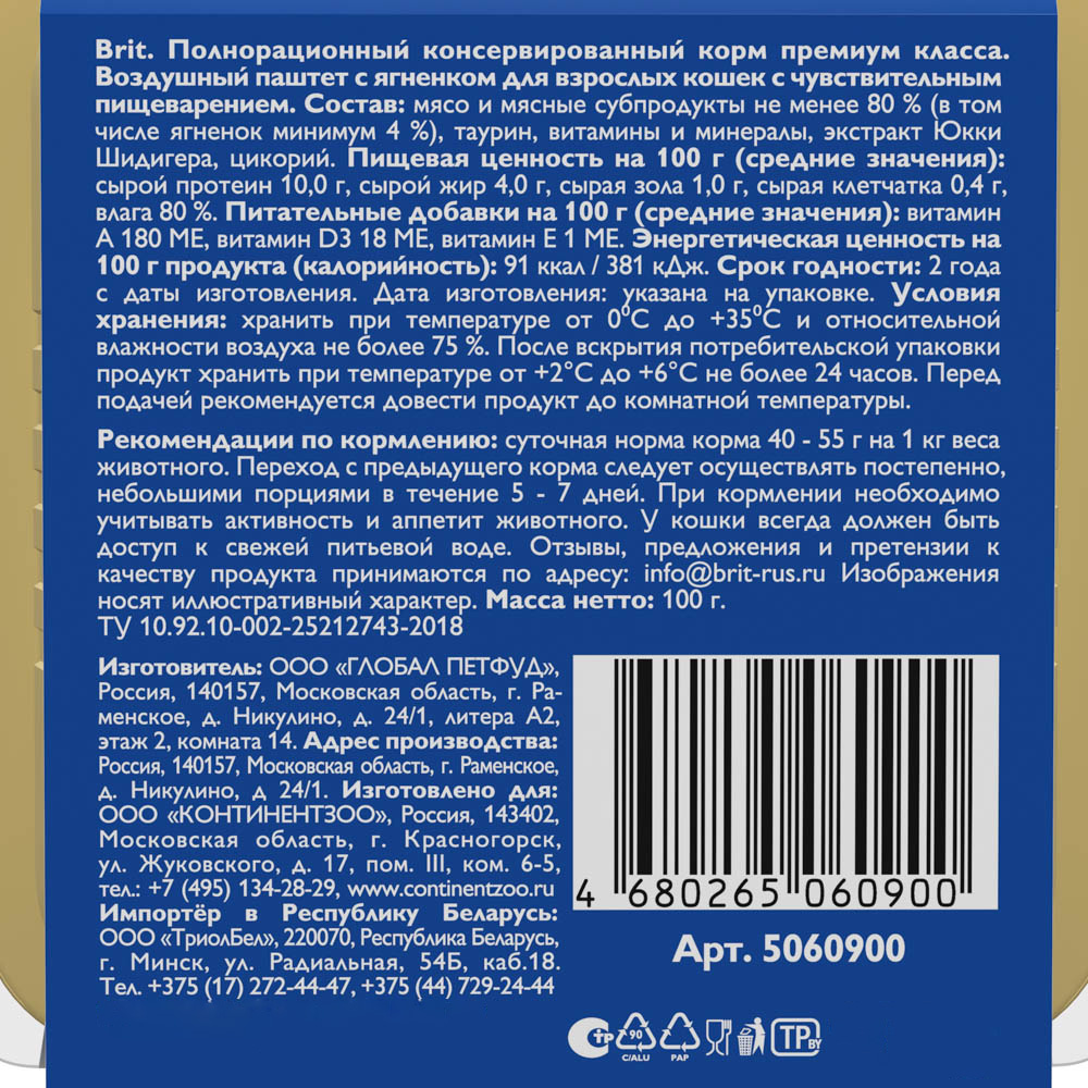 Корм Brit Sensitive Lamb (паштет) для кошек с чувствительным пищеварением, с ягненком, 100 г