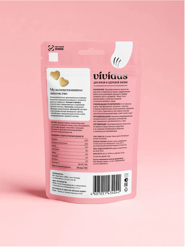 Новинка от бренда Vividus — специальное лакомство, обогащенное комплексом витаминов и минералов для поддержания здоровья котят и беременных кошек. Каждая таблетка содержит ключевые нутриенты, необходимые для гармоничного развития и укрепления организма в важные периоды жизни. Мультивитаминное лакомство - отличный источник дополнительных полезных веществ и незаменимая добавка к основному рациону животного. Кальций и фосфор способствуют формированию и укреплению костной системы. Гемоглобин нормализует функцию кроветворения. Витамин Д3 участвует в регуляции кальций-фосфорного обмена, способствует минерализации костей и зубов и формированию здорового костяка. Универсальность Легко сочетается с любым типом кормления — натуральным рационом, сухими или влажными кормами. Базовая норма — 5−6 таблеток в день. Дозу можно увеличить в 1,5−2 раза в периоды повышенных нагрузок, стресса, болезни или реабилитации, что делает добавку гибкой и отвечающей потребностям питомца. Специализированная формула Разработана с учетом повышенных потребностей в питательных веществах у котят и беременных/лактирующих кошек. Комплекс гемоглобина, кальция, фосфора и витамина D3 целенаправленно поддерживает: Нормальное кроветворение и снабжение кислородом. Формирование крепкого костяка и зубов. Здоровый кальций-фосфорный обмен. Натуральная основа • Содержит полезные ингредиенты — пивные дрожжи, молочную сыворотку, сухое молоко, лимонный сок, витамины группы B и C. • Соответствие стандартам: • Продукт сертифицирован и соответствует требованиям безопасности и качества. • Длительный срок хранения: 24 месяца при соблюдении простых условий (сухое, темное место). Формат полезного лакомства Таблетированная форма воспринимается кошками как вкусное поощрение, что упрощает регулярный прием без стресса. Выгодный объем: Упаковка содержит 90 таблеток, что обеспечивает длительный курс приема. Подробнее