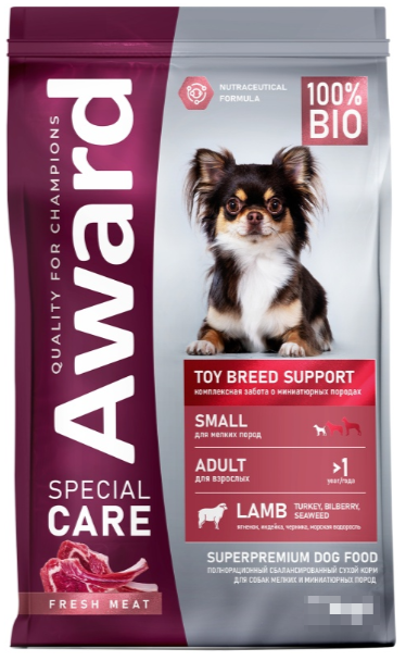 Сбалансированный полнорационный сухой корм со свежим мясом ягненка с добавлением черники и морской водоросли - это функциональное питание для взрослых собак мелких и миниатюрных пород, которое учитывает уникальные породные особенности, обеспечивает комплексную заботу о здоровье вашего питомца и дарит активность и отличное самочувствие на долгие годы. Корм Award - тщательно сбалансированная рецептура из 100% натуральных ингредиентов, созданная по инновационной формуле, обеспечивающей комплексную нутрицевтическую поддержку организма питомца. All in one - рацион содержит все необходимое для комплексной заботы о вашем питомце. Свежее бескостное мясо в составе обладает высокой вкусовой привлекательностью и является ценным источником легкоусвояемого животного белка. При изготовлении корма использовалась технология 3NRGY — сочетание полезных углеводов, дающее длительный запас энергии и чувство сытости. Добавление водоросли помогает бороться с образованием зубного налета и камня, уменьшает неприятный запах и заботится о чувствительных деснах. Хондропротекторы в составе поддерживают здоровье и функцию суставов и связок. Содержит псиллиум - растворимую клетчатку, получаемую из шелухи семян подорожника, которая способствует нормализации работы кишечника. L-карнитин позволяет контролировать массу тела. Рыбий жир в составе богат незаменимыми жирными кислотами, необходимыми для здоровья кожи и блеска шерсти. Подробнее